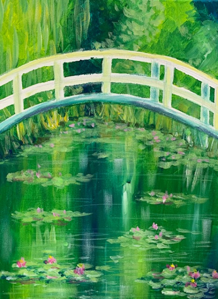 Inspired by the art history and a drawing warm up, students will create a Monet's Garden inspired Watercolour in the morning and then their own Bridge over Waterlilles on Canvas in the afternoon to take home!